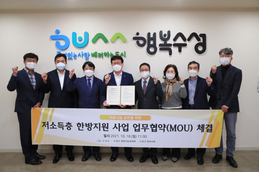 수성구는 지난 18일 수성구 희망나눔위원회(회장 이재수), 수성구 한의사회(회장 최재영)와 ‘저소득층 한방지원 사업 업무협약(MOU)’을 체결했다.