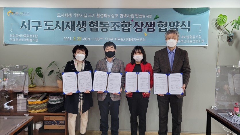 대구 서구청은 4개 마을의 도시재생 협동조합 간 상호 상생협약을 지난달 22일 서구 도시재생 지원센터에서 체결했다고 밝혔다.