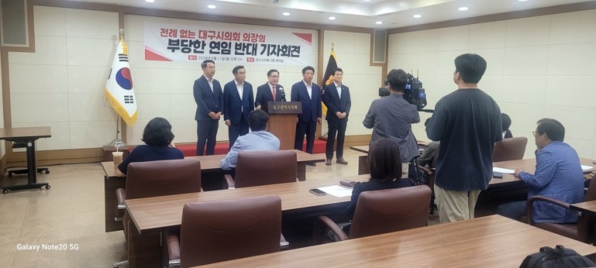 대구시의회에서 17일 김대현 의원외 4명 등은 대구시의회 의장의 부당한 연임 반대 기자 회견을 개최했다.