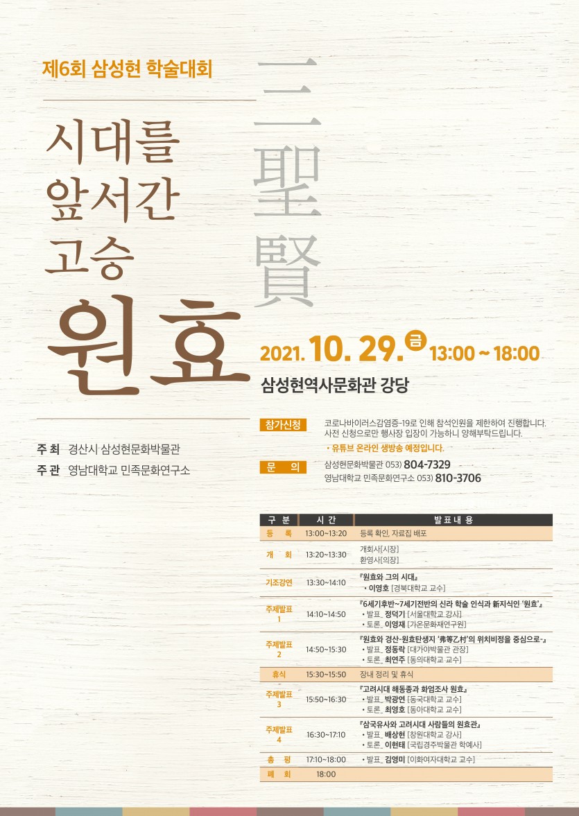 경산시 삼성현문화박물관(관장 권오태)은 오는 29일 “시대를 앞서간 고승, 원효”라는 주제로 제6회 삼성현 학술대회를 개최한다고 밝혔다.