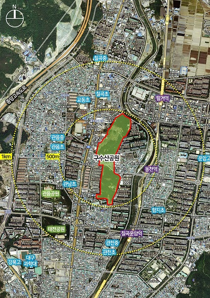 지난 1999년 공원으로 결정된 이후 장기간 조성되지 못한 대구 북구의 대표 도시공원인 구수산공원은 주변의 칠곡지역이 부도심으로 성장하고 인근에 위치하고 있는 함지산, 팔거천 등 천혜의 자연환경과 도시철도3호선 동천역, 칠곡IC 등 접근성이 우수함에도 그간 시민을 위한 공원 역할을 제대로 수행하지 못했다.