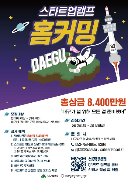 대상자는 만 19세 이상 39세 이하의 대구 지역 외에서 활동하는 청년 (예비)창업자이며, 신청기간은 오는 3일 부터 13일 까지이며 신청은 ‘대구창업허브’를 통해 할 수 있으며, 서류평가 및 면접 심사를 거쳐 참가자 15명(팀)을 결정한다.