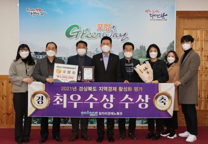 포항시는 지난 14일 ‘2021년 경북도 지역경제 활성화 평가’에서 지난 해에 이어 2년 연속 ‘최우수상’을 수상해, 표창패와 시상금 500만 원을 수여 받았다고 밝혔다.