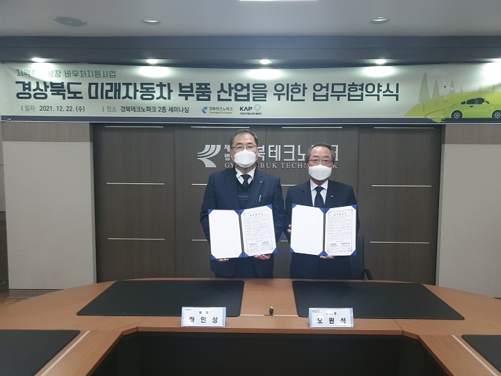 (재)경북테크노파크가 지난 22일, 자동차부품산업진흥재단(이사장 오원석)과 전기차 및 수소차 등으로 재편되고 있는 자동차 부품 산업의 활성화를 위한 업무협약을 체결했다고 밝혔다.