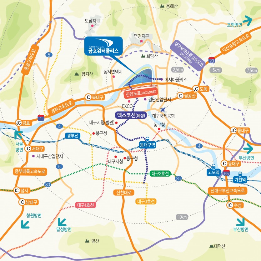 특히, 지난해 말 수성구민운동장역에서 이시아폴리스까지 남북을 연결하는 엑스코선이 정부 예비타당성조사를 통과함으로써 금호워터폴리스의 발전에 촉매제 역할을 하며 그 가치를 높일 것으로 기대되며, 검단산업단지~금호워터폴리스~이시아폴리스를 연결하는 신산업벨트로 시너지 효과를 내면서 접근성 향상과 물류비용 절감 등 미래 첨단산업을 이끌어갈 중심지로 부상할 전망이다.