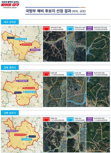 또한 지난 20일 심의위원회를 거쳐 대구시에 최종 통보했으며 후보지로 선정된 군위군, 영천시, 상주시는 군 기능별 임무 수행과 훈련 효과를 발휘하기에 적합하다는 평가를 받았다.