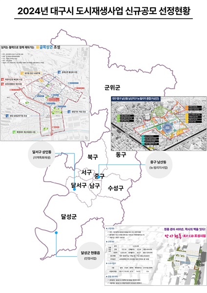 대구시는 23일 국토교통부가 주관하는 2024년 하반기 도시재생 공모사업에서 중구 남산동, 달서구 상인동, 달성군 현풍읍 등 3곳이 최종 선정됐다고 밝혔다.