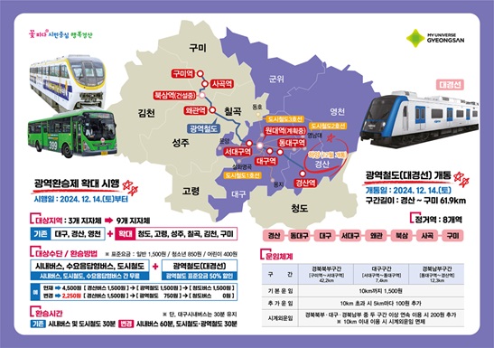 경산시는 대중교통 이용 활성화와 대구-경북 공동생활권 조성을 위해 오는 2024년 12월 14일 대구권 광역철도(대경선) 개통에 맞춰 대중교통 환승 서비스 지역을 확대한다고 밝혔다.