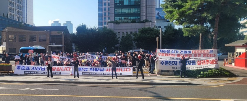대구시 동인청사 앞에서 11일 메트로센터 분양자협의회 등 회원들이 오는 2025년에 만료될 지하도상가 영업권 문제 해결을 요구하며 시위를 벌였다.