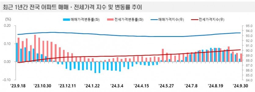 한국부동산원이 발표한 9월 5주(9월 30일 기준) 전국 주간 아파트가격 동향에 따르면, 매매가격은 0.02% 상승하고, 전세가격은 0.05% 상승한 것으로 나타났다.