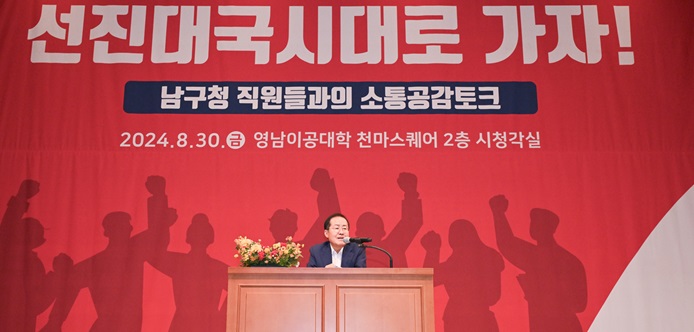 대구시 홍준표 시장은 지난달 30일 남구 영남이공대학 천마스퀘어 시청각실에서 '선진대국시대로 가자!'를 주제로 남구청 직원들과 소통의 시간을 가졌다.