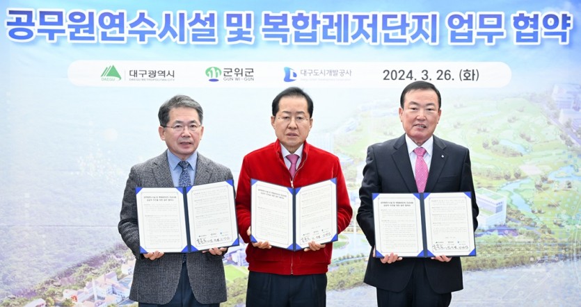 대구시와 군위군, 대구도시개발공사는 26일 산격청사에서 '공무원연수시설 및 복합레저단지 조성사업’을 위한 업무협약을 체결했다고 밝혔다.