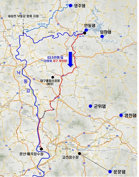 한편 대구시는 취수원 이전방안으로 안동댐 직하류에서 국도변을 따라 최단 거리(110㎞ 정도, 63.5만㎥/일, 9,700억 원 정도)로 도수관로를 연결하는 계획을 선정했다.
