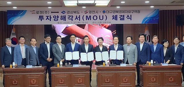 대구경북경제자유구역청은 27일 영천시청에서 김병삼 대구경북경제자유구역청장, 이달희 경북도경제부지사, 최기문 영천시장, 최정호 로젠㈜ 대표이사, 경북도 및 영천시의회 의원 등이 참석한 가운데, 물류기업 로젠과 영천하이테크파크지구 물류단지 투자 양해각서를 체결했다고 밝혔다.