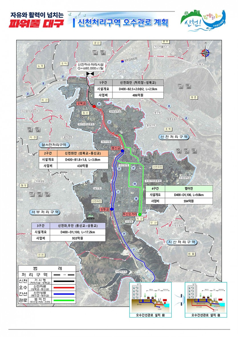 이번 신천 수변공원화 계획은 총사업비 5890억원(국1709, 시4181)으로 고품격 수변공원화, 건강한 물길 복원, 시민 일상향유 공간조성, 지속가능하고 미래지향적인 행정시스템 구축의 4대 전략과 10개의 실행계획을 통해 신천을 대구 대표 여가 공간과 관광거점으로 만드는 것이다.