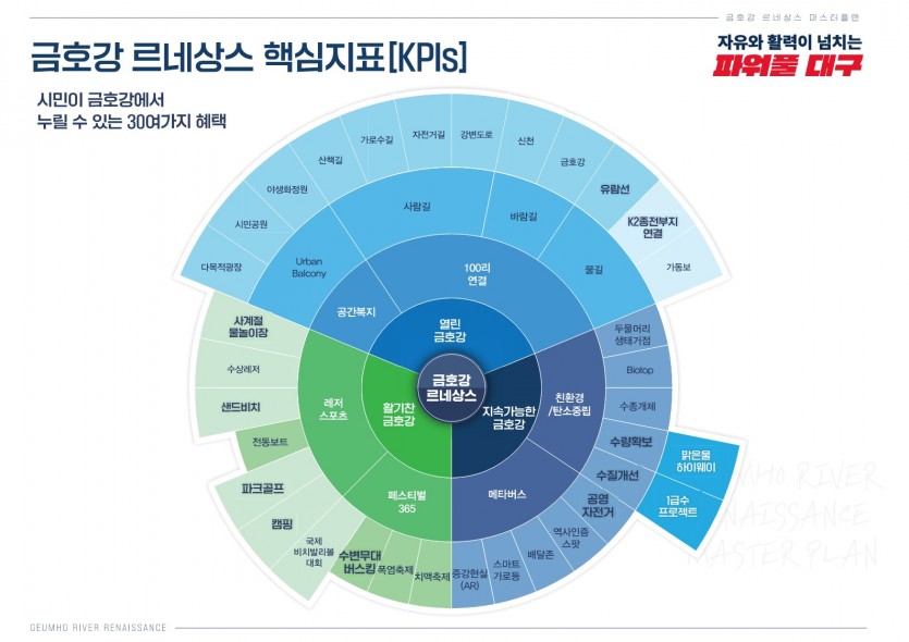 이번 마스터플랜은 총사업비 5400억원(국비 3300억, 시비 2100억)을 투입해 열린 금호강, 활기찬 금호강, 지속가능한 금호강의 3대 목표와 30여 가지 실행계획을 통해 시민 공간복지를 실현하고 지역경제를 활성화하며 기후위기에 강한 글로벌 내륙수변도시 대구를 만들 계획이다.